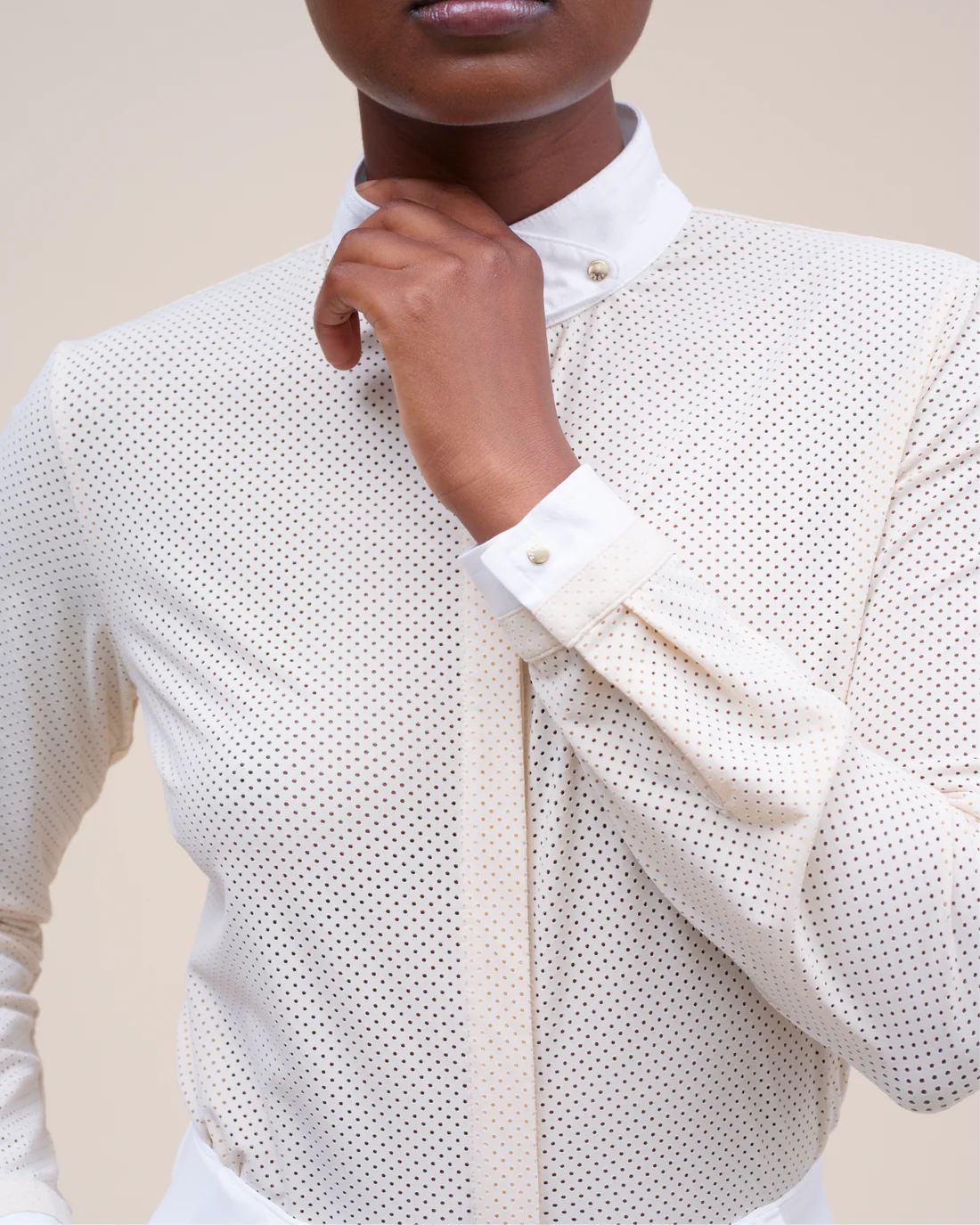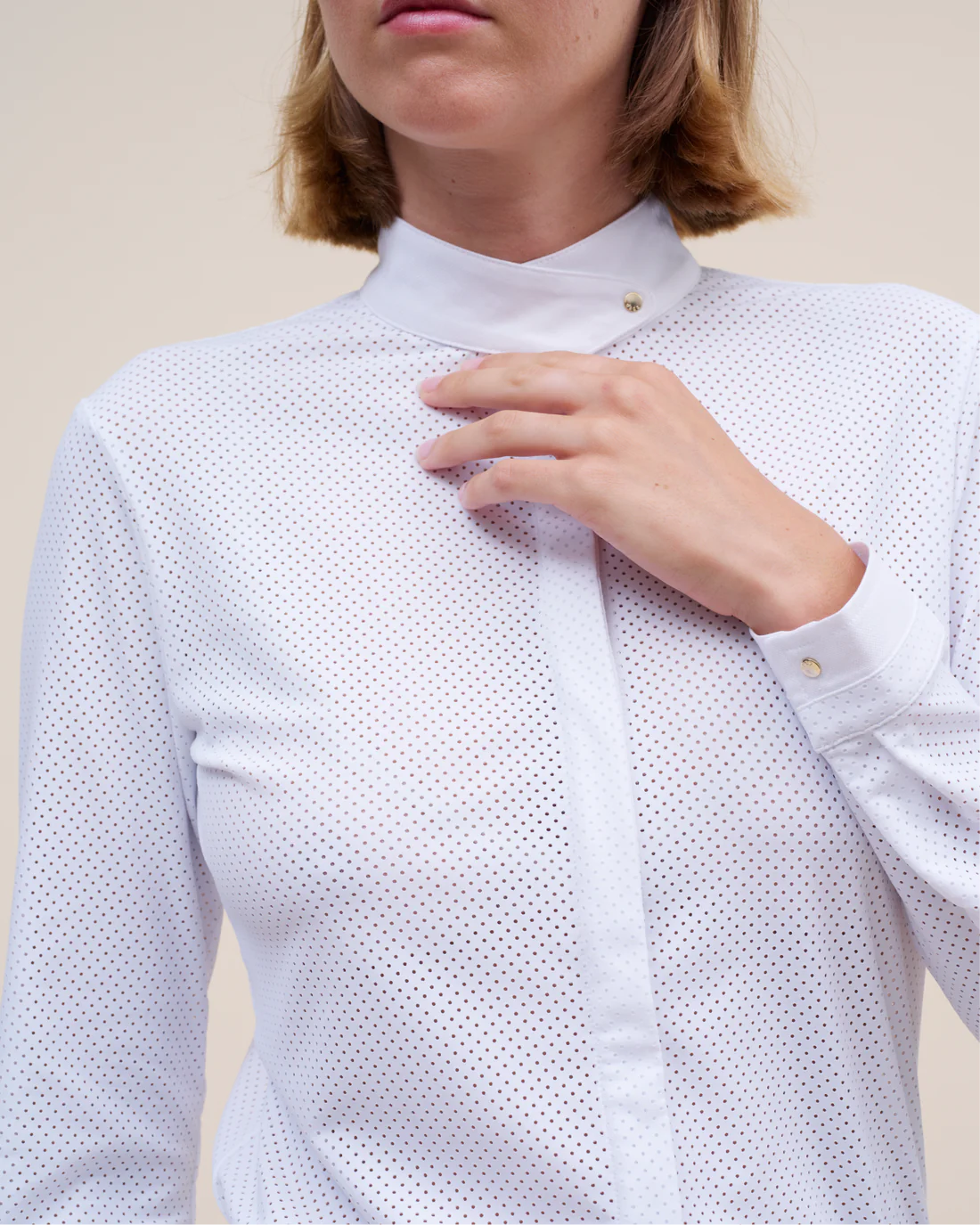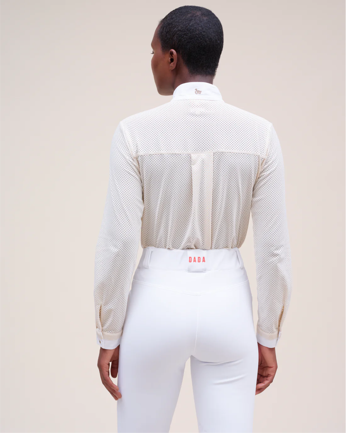 This long-sleeved shirt completes our range of competition shirts, offering a contemporary and elegant look for your competitions. Made from a micro-perforated fabric, it combines a modern riding style with optimal breathability. The dense fabric prevents any transparency, guaranteeing comfort and discretion. The cut of this shirt is designed to perfectly fit the silhouette while offering great freedom of movement, thanks to the pleat in the back. The cuffs close with two snaps: a Dada logo snap, placed on the same cotton fabric as the collar and an invisible snap on the main fabric, for a discreet finish.