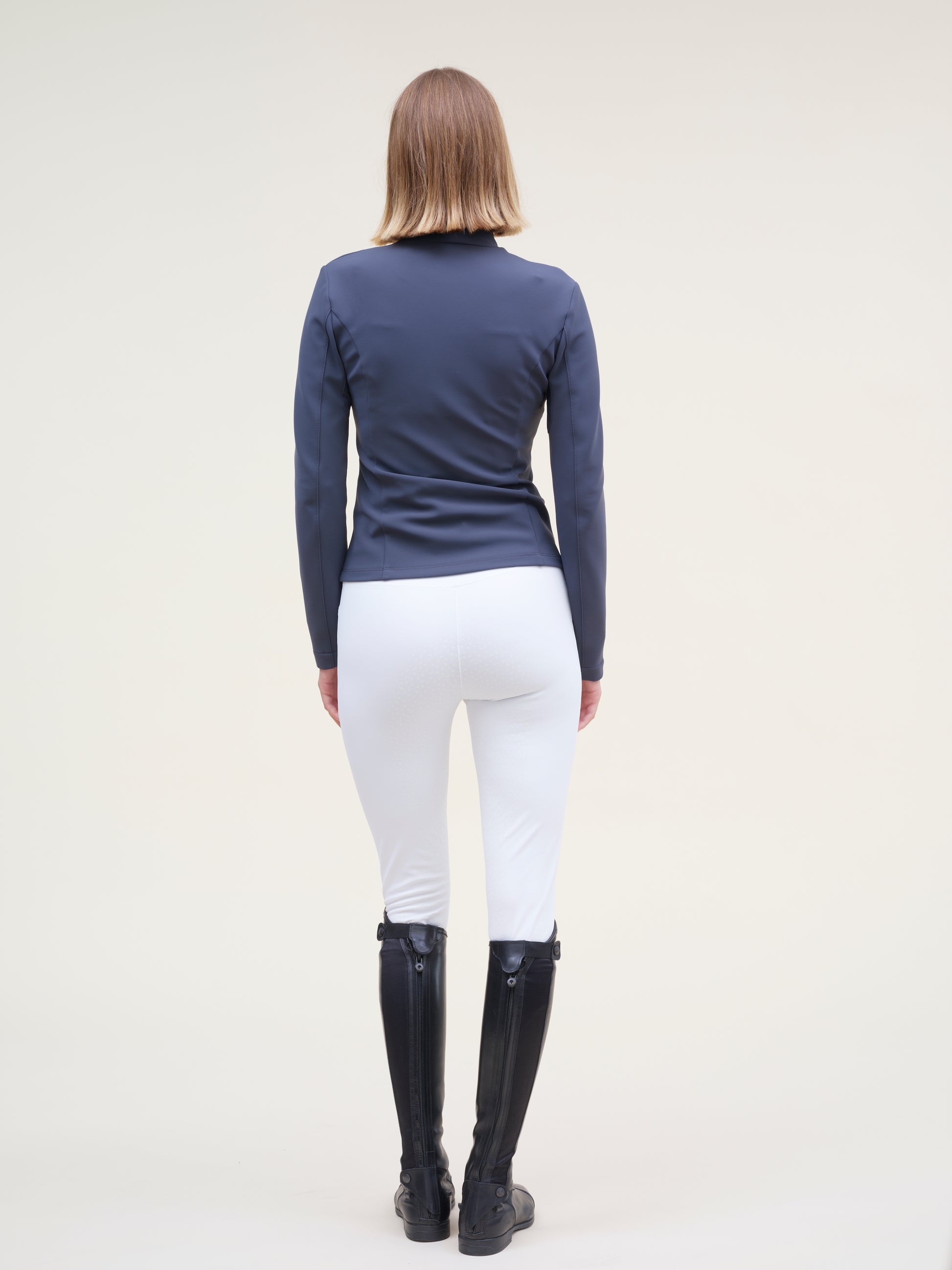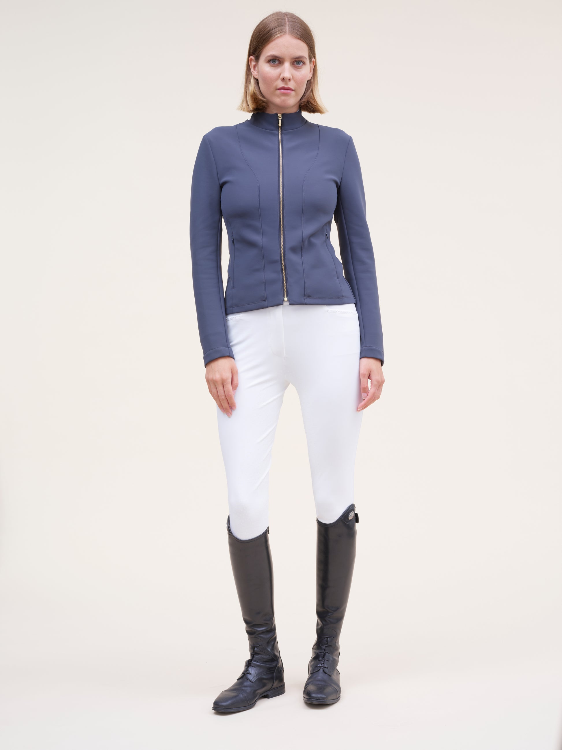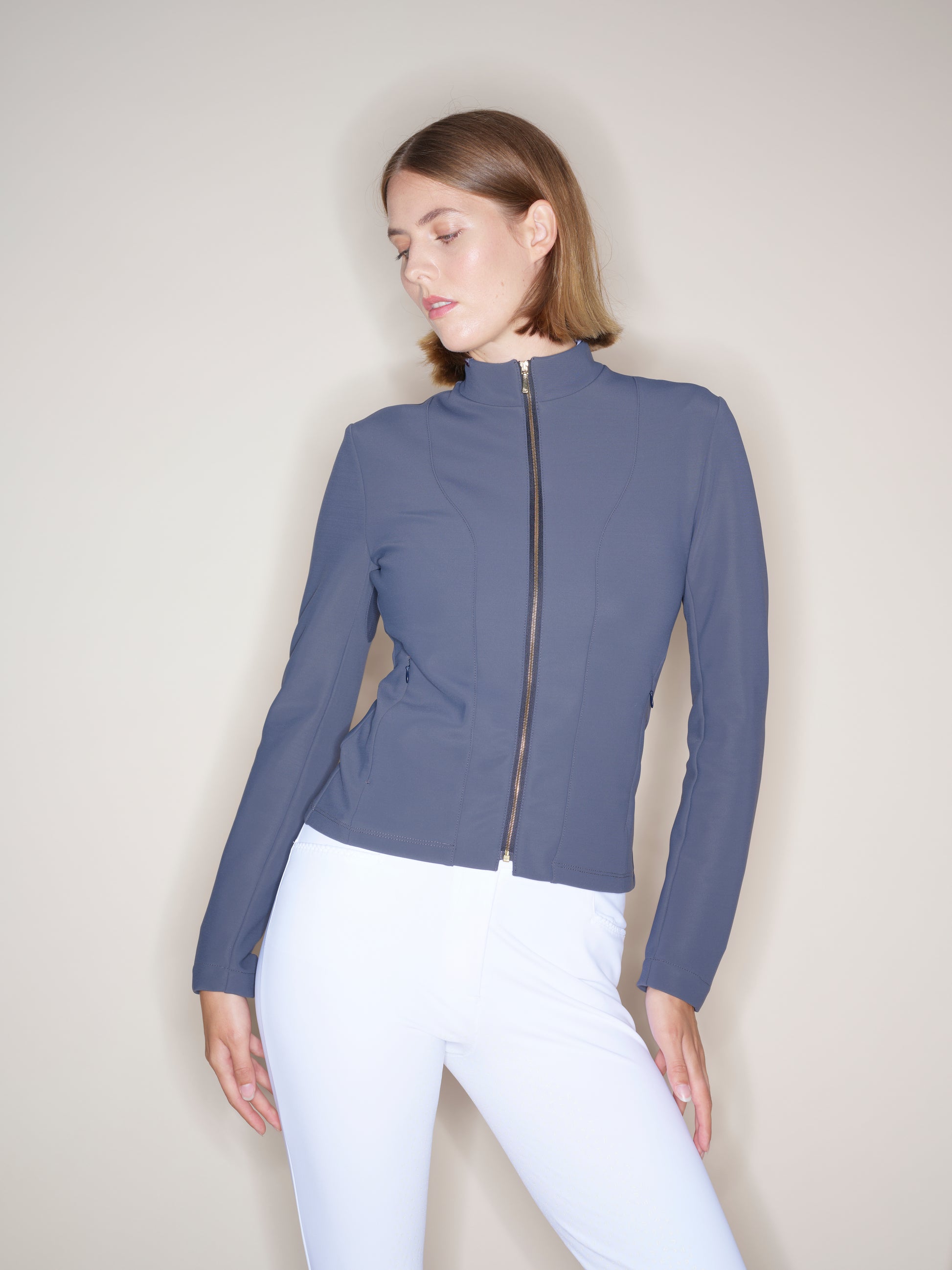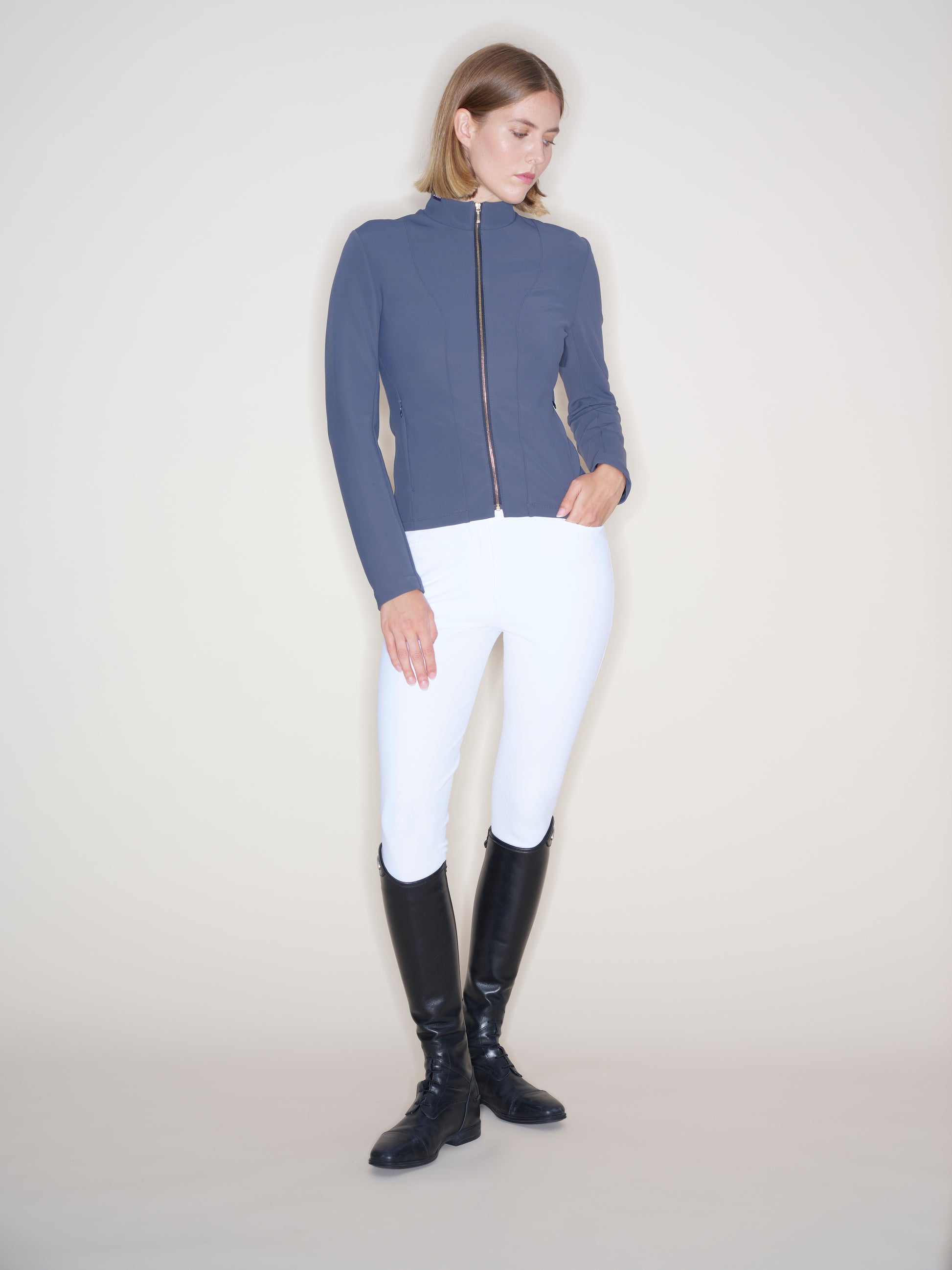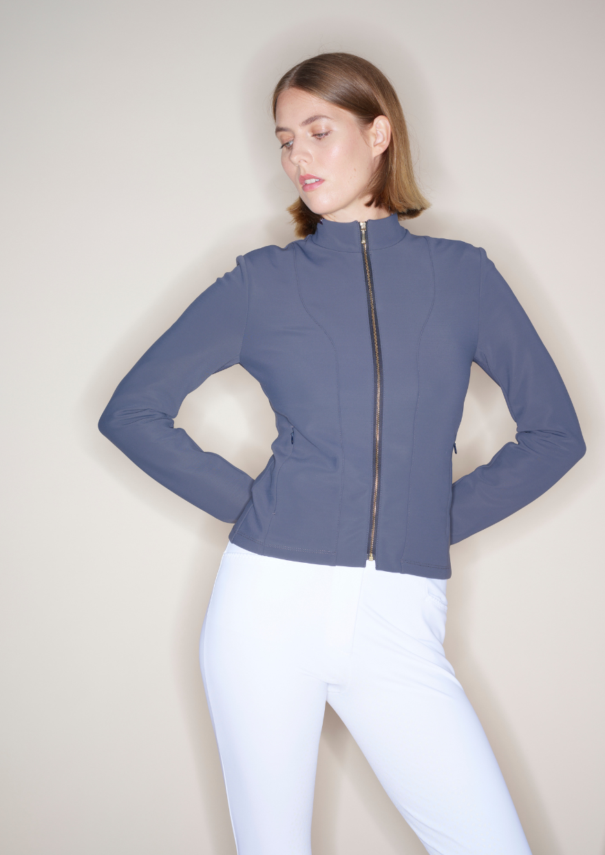 - Unique details: light gold zipper with farrier nail-inspired pull, mesh underarm panels and officer collar