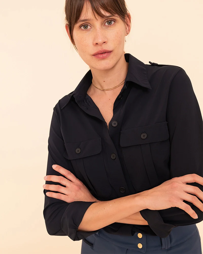 This safari shirt combines lightness, fluidity and breathability. Featuring flap pockets on the chest and tabs on each shoulder, it offers both style and functionality.