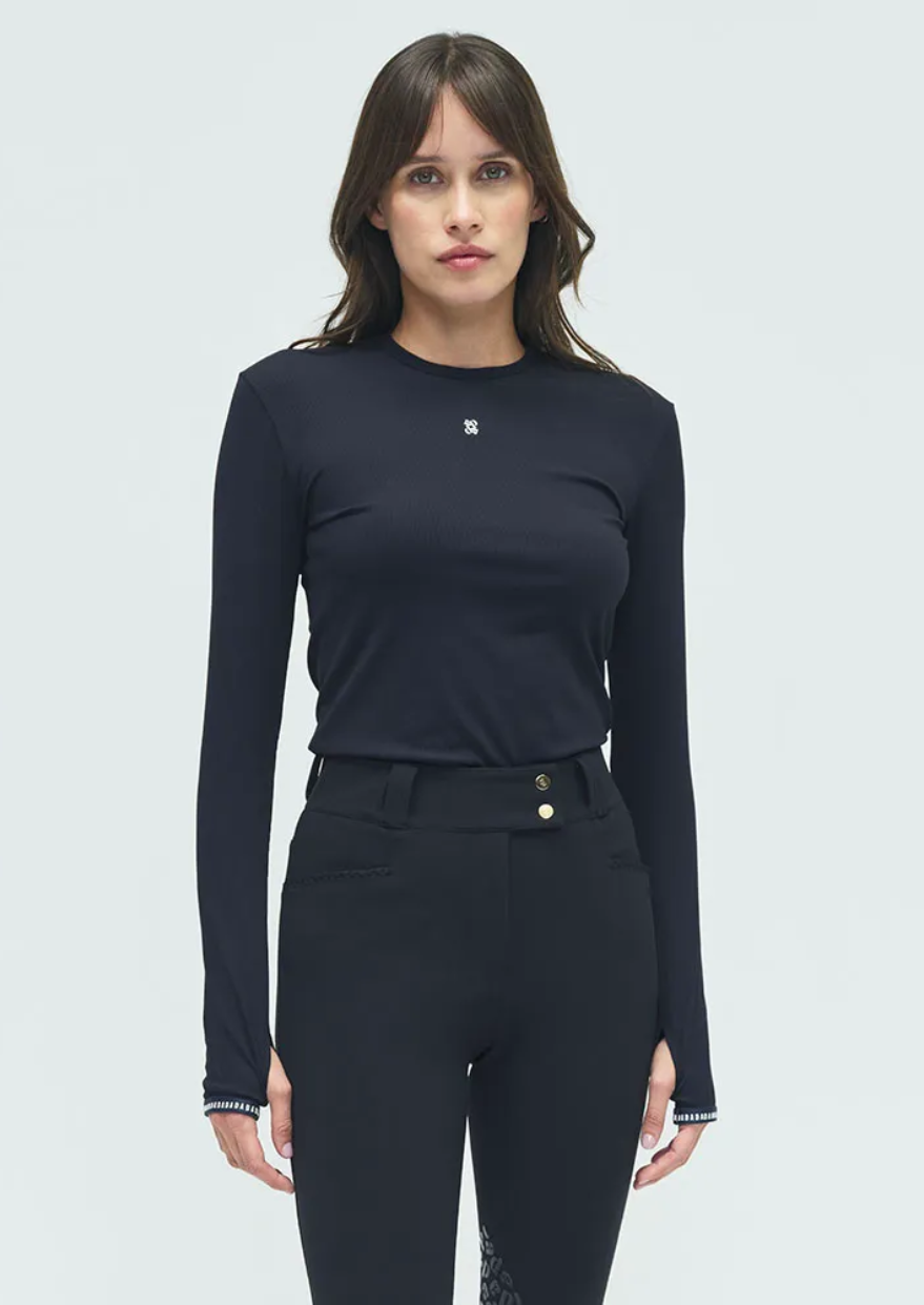 Long-Sleeve Technical Equestrian T-Shirt – Breathable, ribbed, and ultra-comfortable with a tailored fit and practical thumbholes. Perfect for riders seeking performance and elegance.