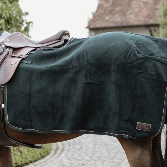 The Quarter Rug Heavy Fleece is made in the same fabric that the popular Fleece Rug Heavy from Kentucky Horsewear. It gives it the same look and hand feel than a wool rug, without the inconveniences this fabric can bring. While warming up, the Quarter Rug Heavy Fleece will keep your horse warm. When cooling down, it will let sweat evaporate, allowing your horse to dry quickly. This Quarter Rug Heavy Fleece features two Velcro fastenings to attach to the saddle, as well as a tail cord. The Kentucky logo in brown artificial leather give it a very fancy look. The rug is machine washable at 30°, no dryer.