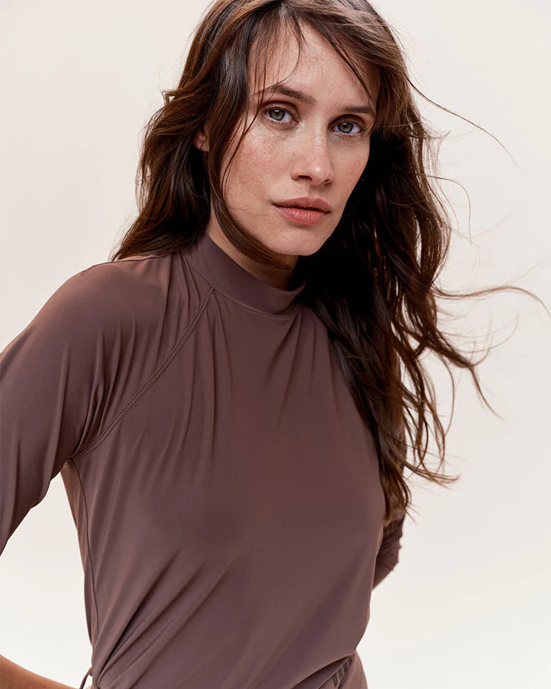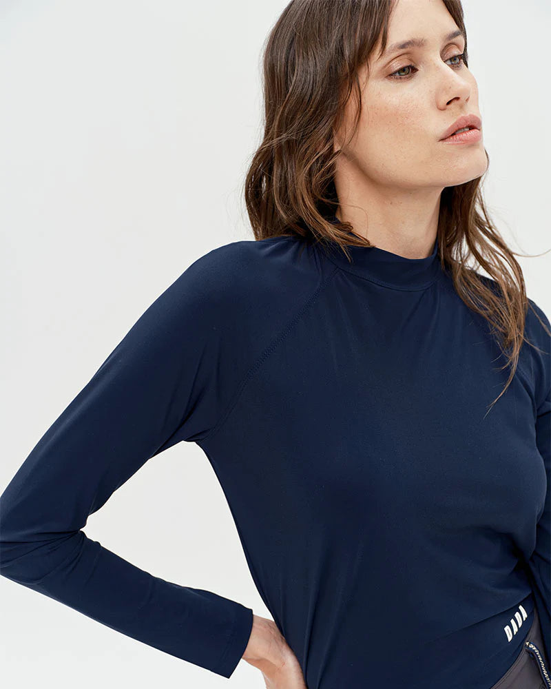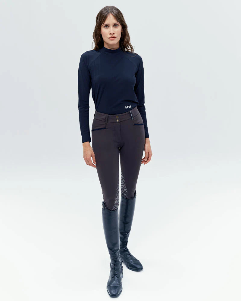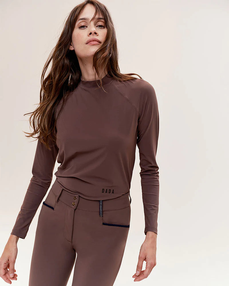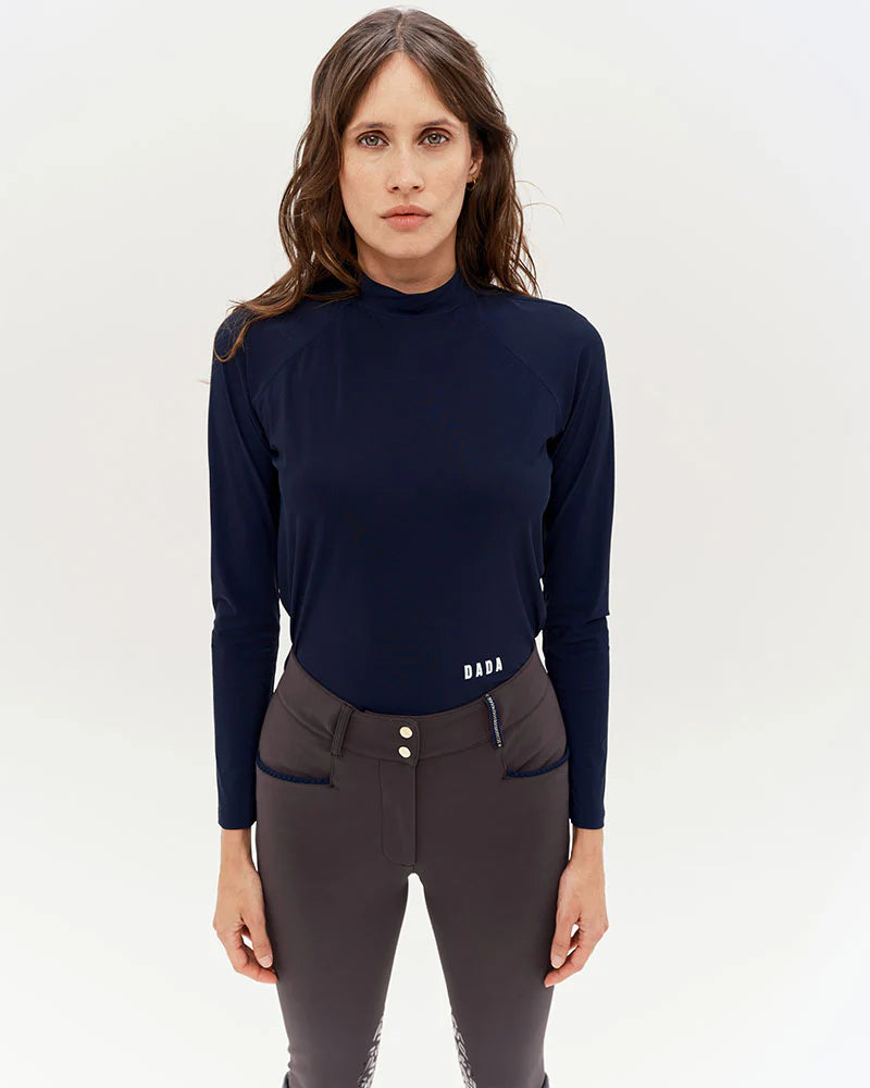 Technical light long-sleeved T-shirt, designed for riders looking for comfort and performance. With its ultra-breathable, lightweight and UV-protective Italian fabric, it offers a fitted cut and a high collar ideal for riding. Available in coffee, black and navy, this model combines elegance and practicality thanks to its easy care.
