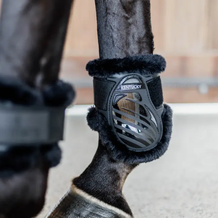 The Vegan Sheepskin young horse Boots are made of Kentucky's highly breathable Vegan Sheepskin that is used since many years for their famous Shipping halter, Show Rug and girths. They have a robust outer shell made of lightweight yet strong TPU shell.