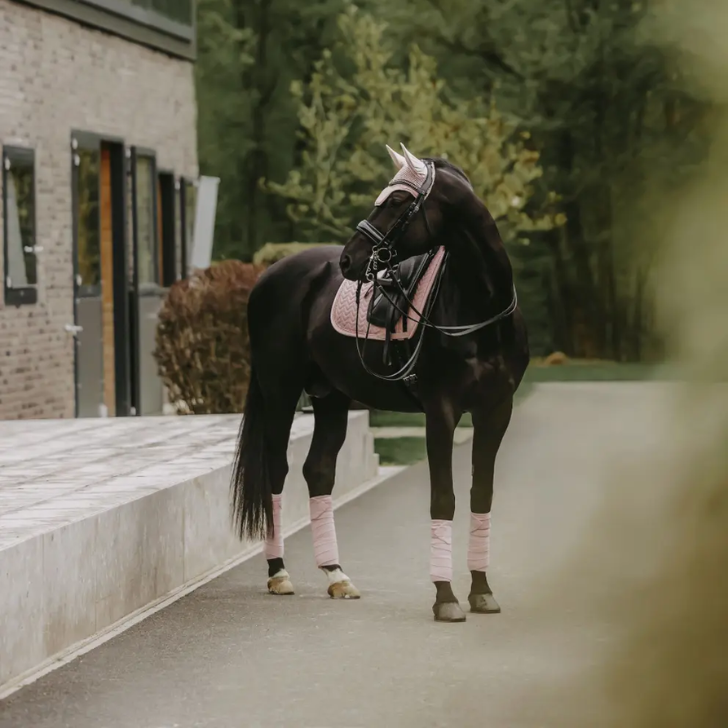 The outside of the saddle pad is made from Kentucky's famous and soft velvet fabric in fishbone quilting. The piping is finished off with chic pearls. The lining of the saddle pad is a cotton and polyester mix which easily absorbs sweat and is very breathable.
