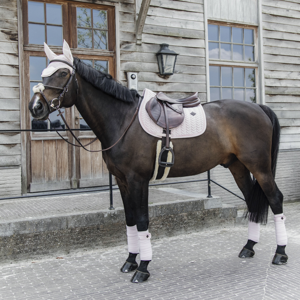 The outside of the saddle pad is made from Kentucky's famous and soft velvet fabric in fishbone quilting. The piping is finished off with chic pearls. The lining of the saddle pad is a cotton and polyester mix which easily absorbs sweat and is very breathable.