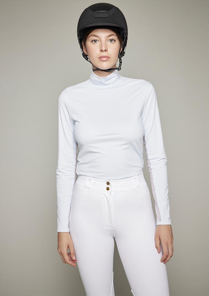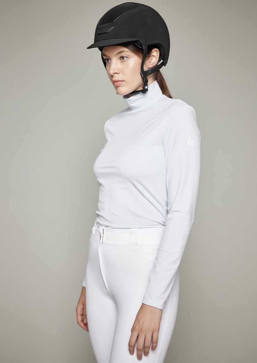 More in detail, this piece has been designed with a funnel neck and long sleeves in highly breathable technical fabric. Full-length tulle inserts under the arms enhance the garment's breathability. The monogrammed DADA logo appears on the upper left arm as a signature. The dense fabric used in its design avoids any see-through effect.