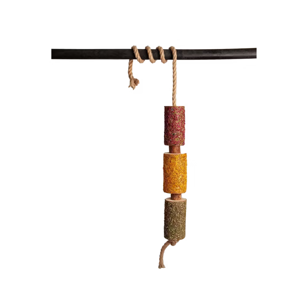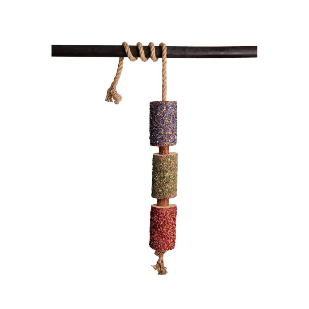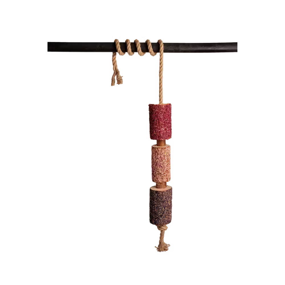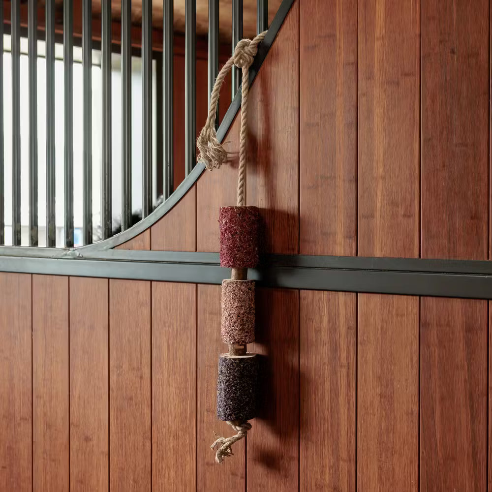 Each piece of wood is hand-selected from the forest, left in its natural state—undried, and untreated—to preserve the authentic smells and textures that horses instinctively respond to.The De-Stress version is enhanced with a soothing blend of herbs, each chosen for their natural benefits: